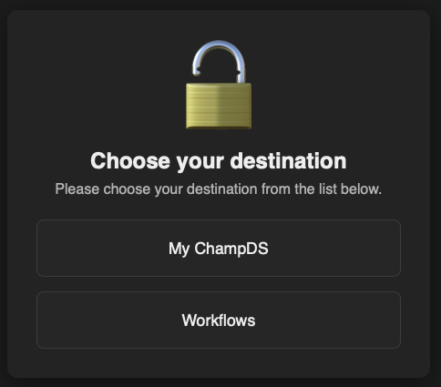 “My ChampDS” will take you to your normal login for CHAMP. “Workflows” will take you to the new CHAMP Workflows Alpha platform.